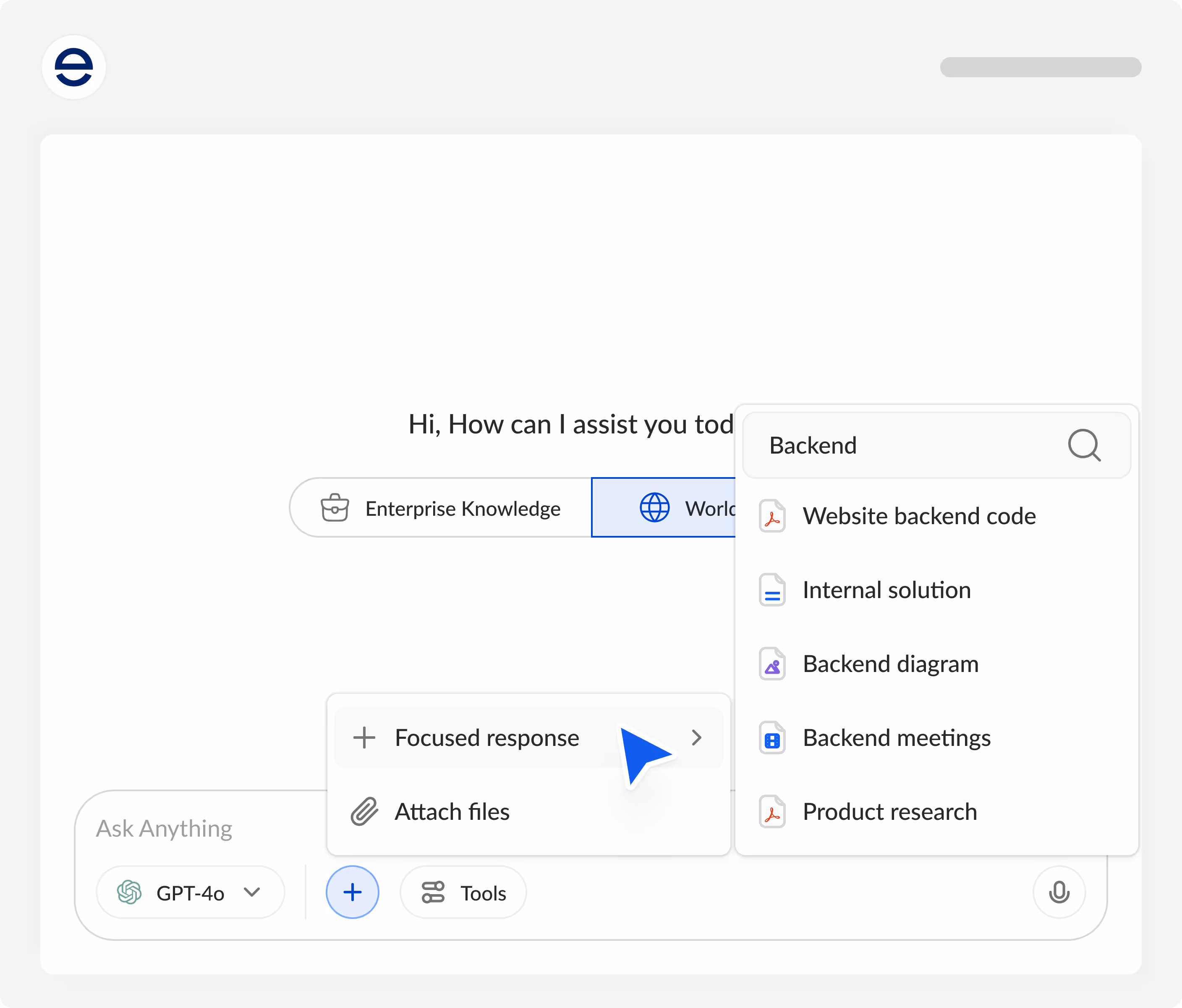 Weitere Dateien für den Fokusmodus hinzufügen: Laden Sie bei Bedarf zusätzliche Dokumente hoch, um den Kontext zu verfeinern und präzisere, fokussierte Unterstützung zu ermöglichen.